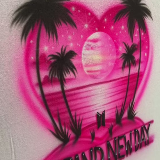 A Brand New Day is a radiant, hand-airbrushed design featuring a glowing heart-shaped sunset over the ocean, centered around a luminous planet that feels like a rising sun. Palm trees frame the shoreline, with twinkling stars and soft sky accents creating a dreamy, otherworldly atmosphere.