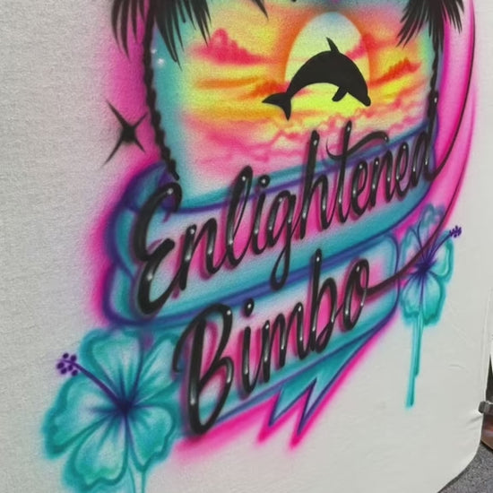 Dreamy sunset vibes with bold airbrush attitude. This Enlightened Bimbo design features a glowing heart-shaped beach sunset with palm trees, hibiscus flowers, and a dolphin silhouette, all surrounded by vibrant airbrush color blends and signature starburst accents.