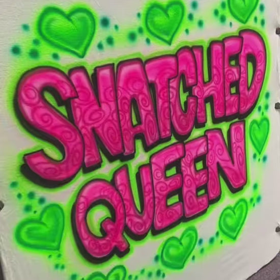 Snatched Queen is a bold, high-energy airbrushed design featuring stacked graffiti-style lettering surrounded by playful heart accents and textured swirl details.